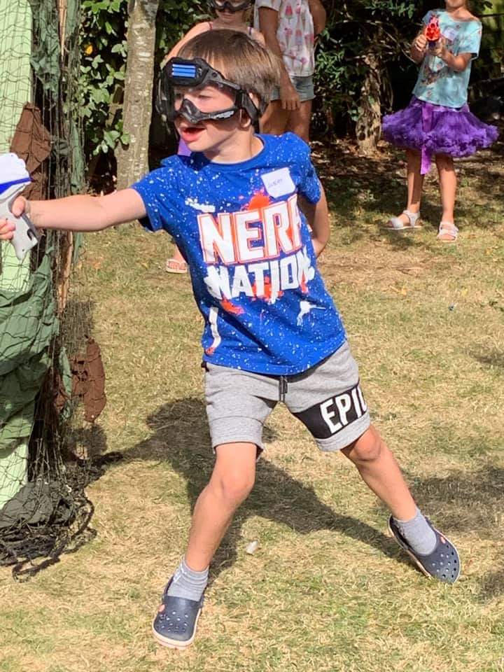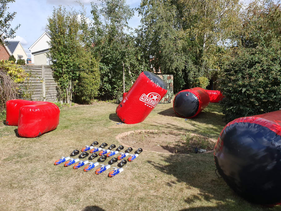 Our awesome nerf war parties suitable for age 5 to 11 include: Nerf guns Bullets Safety goggles Battle target range Battle arena Inflatable bunkers Nerf bouncy castle for fun while kids not in game