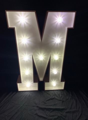 4ft 'M' Light up letter, handcrafted in white wood with white led bulbs. Great additional venue décor for your wedding or event. This letter is a great for initials or names.