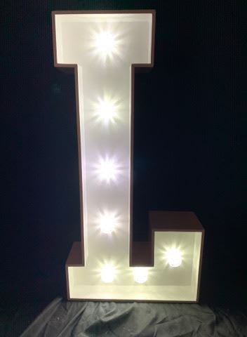 4ft 'L' Light up letter, handcrafted in white wood with white led bulbs. Great additional venue décor for your wedding or event. This letter is a great for initials or names.